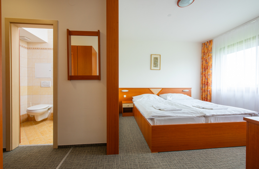 Komfortne zariadená dvojposteľová izba s manželskou posteľou pre 2 osoby prepojená s dvojposteľovou izbou s 2 oddelenými lôžkami pre 2 osoby s možnosťou 1 prístelky. Každá izba má vlastné sociálne zariadenie. Detská postieľka na vyžiadanie.